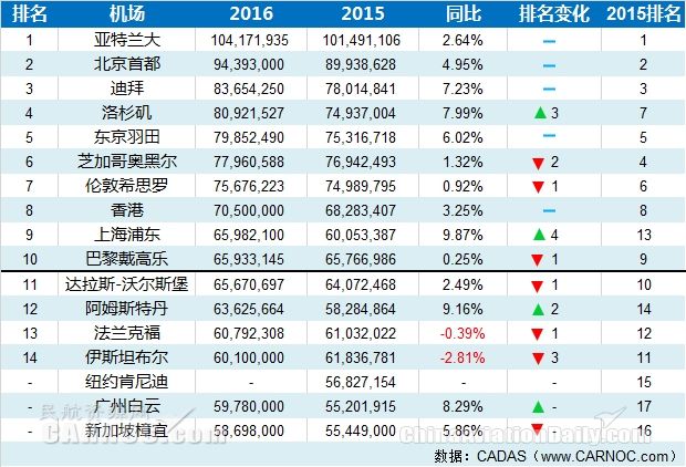 憑借其主要的中轉樞紐地位以及北美地區入境口岸的“戰略位置”,2016年亞特蘭大國際機場旅客吞吐量達到1.04億人次,同比增長2.64%。北京首都國際機場旅客吞吐量突破9000萬人次,達到了9439.3萬人次,同比增長約5%。迪拜國際機場繼續保持較高速的增長,發送旅客8365萬人次,保持第三。